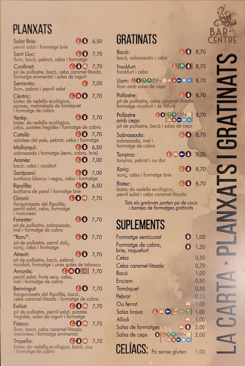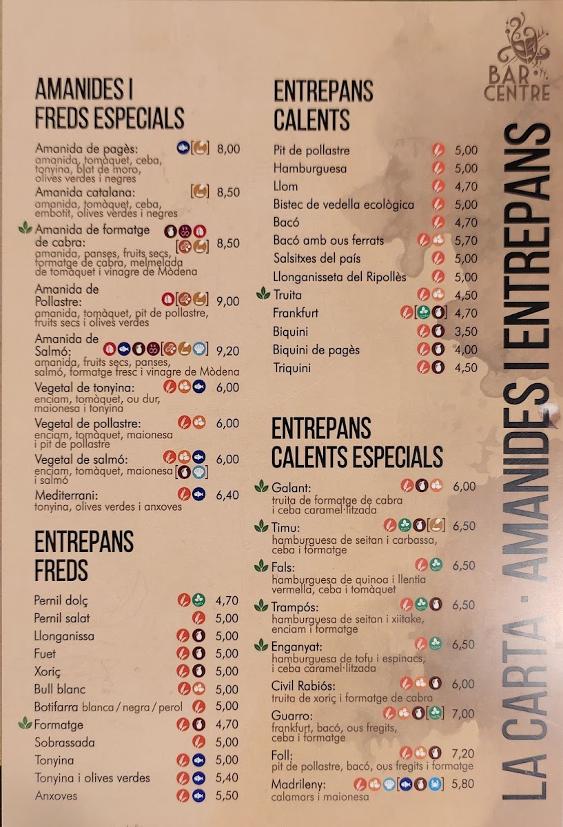 The menu at Bar Centre offers a variety of options suited for different times of the day, including light meals, snacks, and beverages. Its selection includes traditional tapas, fast food-style sandwiches, and a range of drinks suitable for casual dining or quick orders.