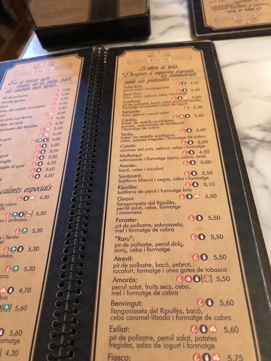 - Sandwiches and Light Meals: Features a variety of entrepans and bocatas, including options like fuet, bacon with eggs, and grilled cheese with sobrasada, catering to quick and casual dining needs.